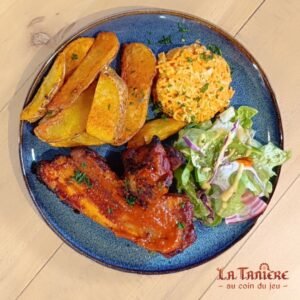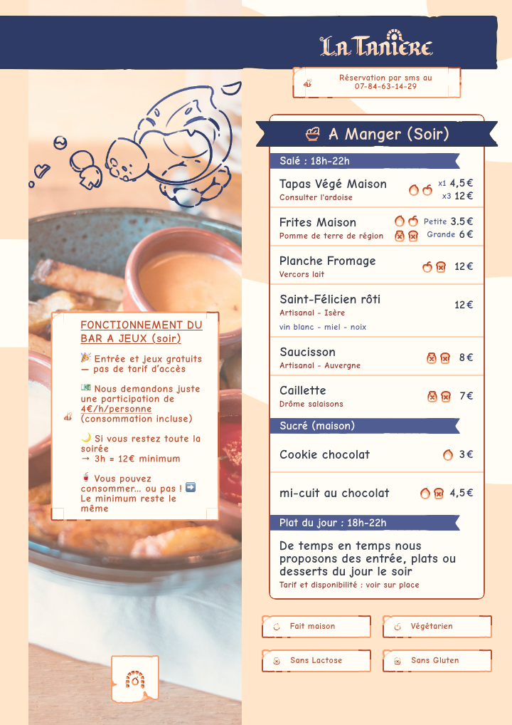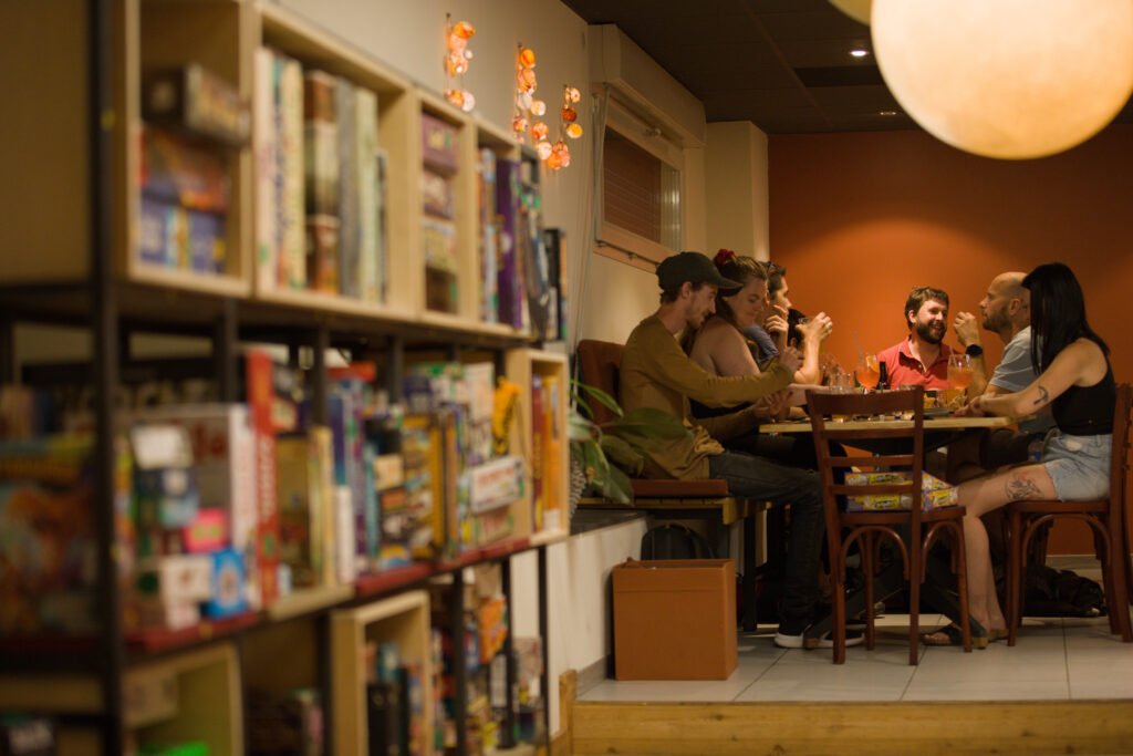 Le soir, nous vous proposons plus de 400 jeux et nous vous conseillons en fonction de ce que vous aimez déjà ou voulez découvrir ! 🃏👨👩👧👦 Et parce que dans « bar à jeux » il y a aussi « bar », nous proposons aussi une carte de boissons, tapas et planches à partager. Nous mettons en avant autant que possible des fournisseurs et produits locaux et artisanaux. 🍔🍻