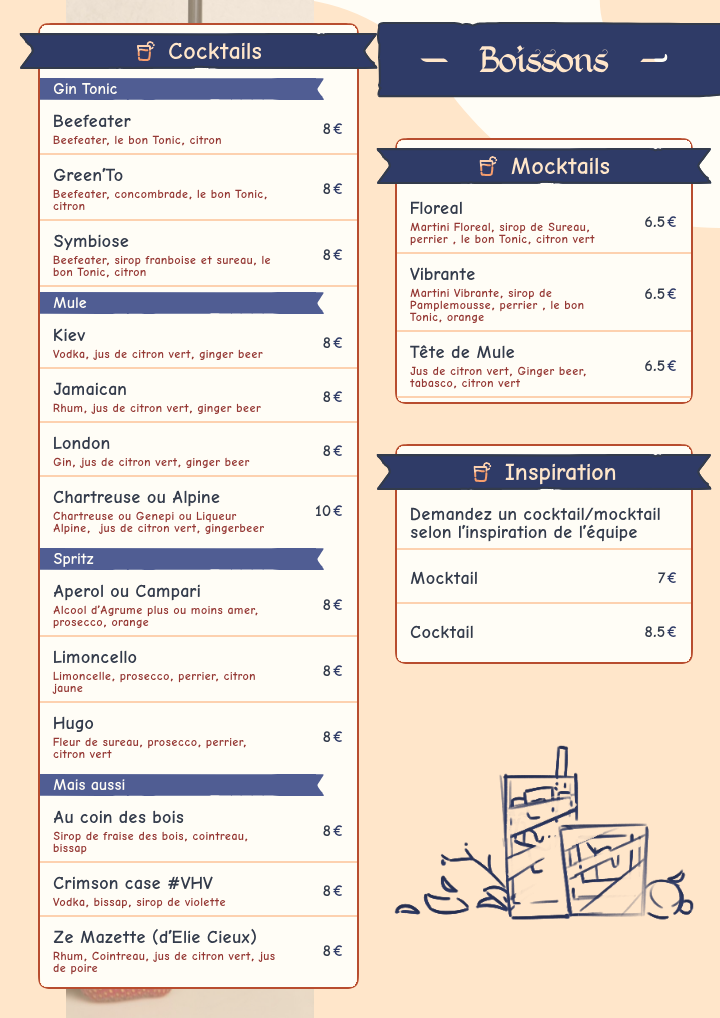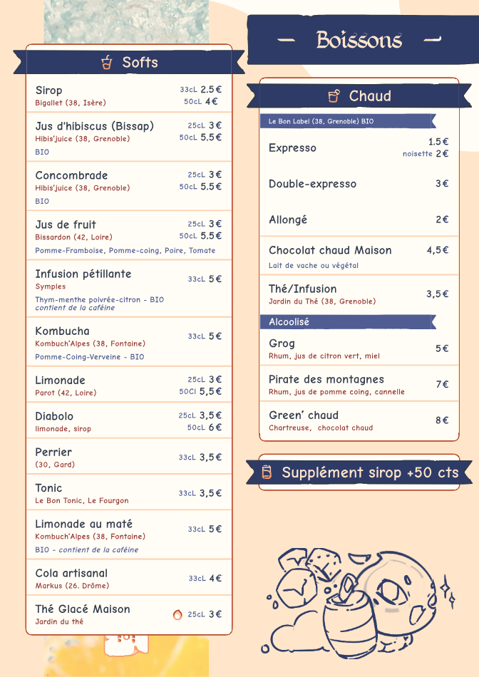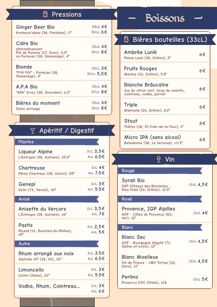 Pour accompagner votre soirée jeux, nous proposons à la carte des boissons locales : bières en pression ou bouteille, softs divers et variés, cocktails ou mocktails, vins, liqueurs, boissons chaudes, etc.