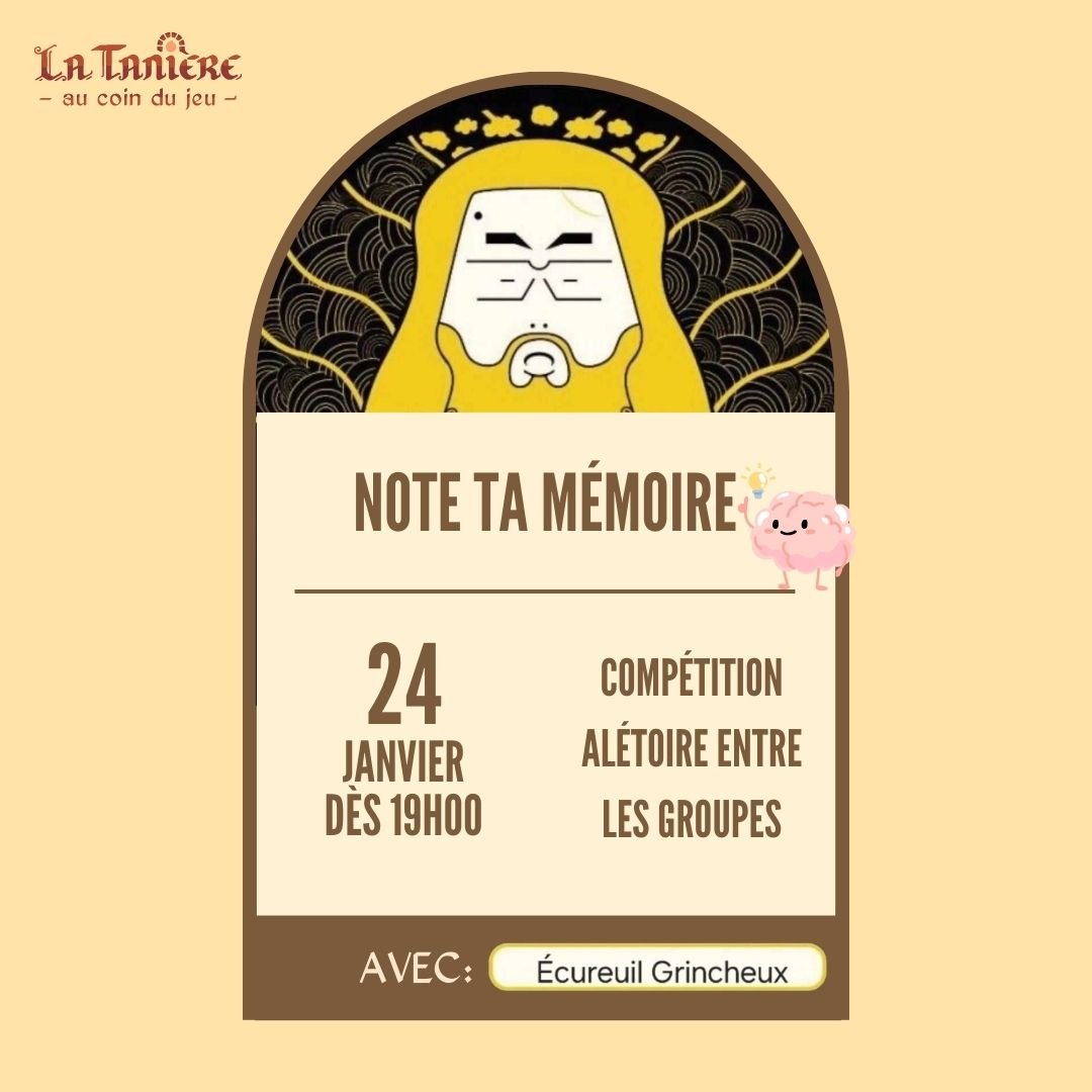 Vendredi 24 janvier, nous aurons l’honneur d’accueillir Écureuil Grincheux qui animera une petite session de « note ta mémoire », un jeu de quiz de son cru ou il se promènera entre les groupes pour poser des questions sur des sujets aléatoires.